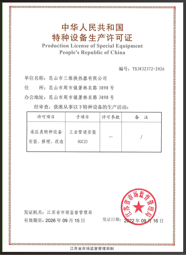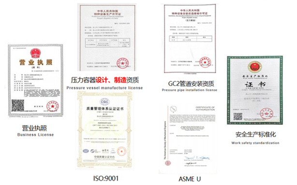 A2壓力容器制造許可證,D1/D2壓力容器設(shè)計(jì)許可證;GC2管道安裝許可證;ASME U/NB鋼??;ISO9001、ISO45001、ISO14001體系認(rèn)證證書等。